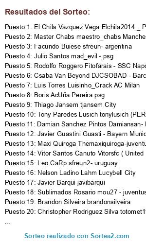 Lista de participantes: Diego Ignacio Salvador Ppe Penta Italia, Jhonny García Jhojagaca PSG, Christopher Rodriguez Silva totomet1986 Bayern Munchen, Faraon Calamar FARAON_CALAMAR (MANCHESTER CITY), Maxi Quiroga Themaxiquiroga-juventus, Javier Guastini Guasti - Bayern Munich, Thiago Jansem tjansem City, Master Chabs maestro_chabs Manchester City, Matias Sanchez Mati-gti89 PSG, Vitor Santos Canuto Vitorsfc ( United ), Brandon Silveira brandonsilveira, Tony Paredes Lusich tonylusich (PERU), Nelson Ladino Lahm Lucybell City, Ticoloko - Bayern de Munique, Naniquio Perez JUGADOR1 UNIVERSIDAD DE CHILE, Luis Torres Luisinho_Crack AC Milan, Rodolfo Roggero Fitofarais - SSC Napoli, Marcelo Adrian alvaradomdp bayer munich, Julio Santos mad_evil - psg, El Chila Vazquez Vega Elchila2014 _ PSG, Sebastian Nicolau SebaCASLA PSG, Sublimados Rosario mou27 - juventus, Leo CaRp sfreun2- uruguay, Jorge Meler Blitz- Bayern munich, Damian Sanchez Pintos Damiansan- Man Utd, Haider Vanegas Haider 13 - Benfica, Ramiro Surbano R4M4FULL - real de madrid, Csaba Van Beyond DJCSOBAD - Barcelona, Javier Barqui javibarqui, Boris AcUña Pereira psg, Jaime J Pineda Jaicolle Manchester City, Facundo Buiese sfreun- argentina.