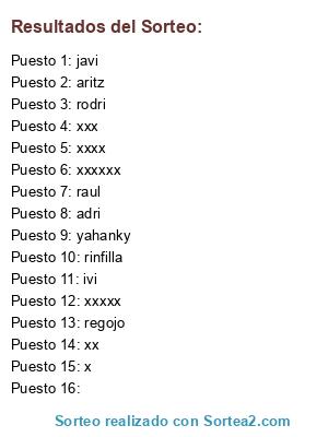 Lista de participantes: adri, vestia, x, xx, xxx, xxxx, xxxxx, xxxxxx, javi, rodri, raul, rinfilla, yahanky, aritz, regojo, ivi, .