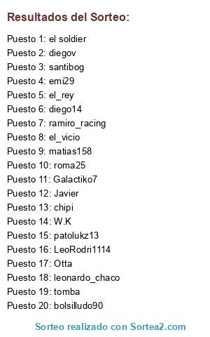 Lista de participantes: bolsilludo90, chipi, diego14, diegov, el soldier, el_rey, el_vicio, emi29, Galactiko7, Javier, leonardo_chaco, LeoRodri1114, matias158, Otta, patolukz13, ramiro_racing, roma25, santibog, tomba, W.K.