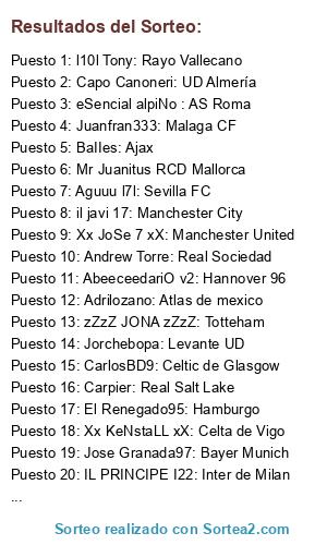 Lista de participantes: l10l Tony: Rayo Vallecano, Panterjack: Villareal, il javi 17: Manchester City, Adrilozano: Atlas de mexico, Mr Juanitus RCD Mallorca, Jorchebopa: Levante UD, Sr Pistolas 86: Juventus, xXxValientexXx: Real Betis, Aguuu l7l: Sevilla FC, BaIIes: Ajax, l Mas7eeRz l : Galatasaray, CarlosBD9: Celtic de Glasgow, eSencial alpiNo : AS Roma, Xx eL SaMu xX: FC Barcelona, Jimmy Baek: Borussia Dortmund, Juanfran333: Malaga CF, IL PRINCIPE I22: Inter de Milan, zZzZ JONA zZzZ: Totteham, Ivan l 96 lx: Atlético de Madrid, AbeeceedariO v2: Hannover 96, x el pardela x: CD Tenerife, Jose Granada97: Bayer Munich, PuTTO ViiLa I: UD Las Palmas, Kuality100: Shrewsbury Town, Xx JoSe 7 xX: Manchester United, Xx KeNstaLL xX: Celta de Vigo, Andrew Torre: Real Sociedad, El Renegado95: Hamburgo, Carpier: Real Salt Lake, BUTR4666: Real Oviedo, Capo Canoneri: UD Almería, BestElTopillo: New York City.