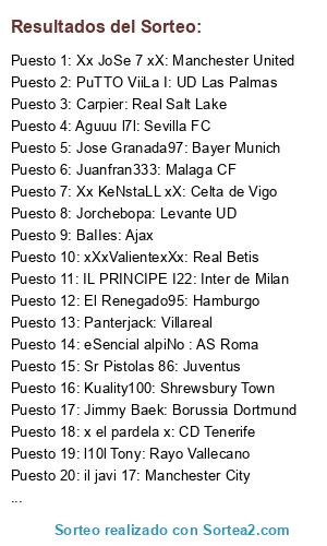 Lista de participantes: l10l Tony: Rayo Vallecano, Panterjack: Villareal, il javi 17: Manchester City, Adrilozano: Atlas de mexico, Mr Juanitus RCD Mallorca, Jorchebopa: Levante UD, Sr Pistolas 86: Juventus, xXxValientexXx: Real Betis, Aguuu l7l: Sevilla FC, BaIIes: Ajax, l Mas7eeRz l : Galatasaray, CarlosBD9: Celtic de Glasgow, eSencial alpiNo : AS Roma, Xx eL SaMu xX: FC Barcelona, Jimmy Baek: Borussia Dortmund, Juanfran333: Malaga CF, IL PRINCIPE I22: Inter de Milan, zZzZ JONA zZzZ: Totteham, Ivan l 96 lx: Atlético de Madrid, AbeeceedariO v2: Hannover 96, x el pardela x: CD Tenerife, Jose Granada97: Bayer Munich, PuTTO ViiLa I: UD Las Palmas, Kuality100: Shrewsbury Town, Xx JoSe 7 xX: Manchester United, Xx KeNstaLL xX: Celta de Vigo, Andrew Torre: Real Sociedad, El Renegado95: Hamburgo, Carpier: Real Salt Lake, BUTR4666: Real Oviedo, Capo Canoneri: UD Almería, BestElTopillo: New York City.