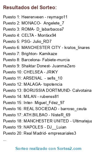 Lista de participantes: CHELSEA - JRIKY, MANCHESTER CITY - kratos_linares, CELTA - Montixx94, SPARTK DE MOSCU- aemepoam, NAPOLES - DJ__Luian, MANCHESTER UNITED - Ultimatejuanma, ATH.BILBAO - NisteR_69, MILAN - rubenss81, MALAGA- topotencia, BORUSSIA DORTMUND- Calvotainas, ATLETICO DE MADRID- LUISKAYAZA, PSG- Julio_RD7, VAELNCIA - lalillo46, ROMA- D_labarbacoa7, ARSENAL - sefis_10, Benfica - guanchu, REAL SOCIEDAD - barroso_ceuta, Brighton- Kamikaze, Heerenveen - reymago11, Oporto- Ceutito, boca juniors- honda_ipr_civic, SEVILLA- Jimenystelrooy85, Barcelona- Fabiete-murcia, Inter- Miguel_Fdez_97, Shaktar Donest- JuanmaZero, Real Madrid- empresariales3, MONACO- Angelete_7, Liverpool- malagueo.