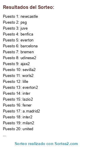 Lista de participantes: r.madrid, rmadrid2, barcelona, barcelona2, a.madrid, a.madrid2, sevilla, sevilla2, valencia, valencia2, villarreal, villarreal2, malaga, malaga2, bilbao, bilbao2, español, español2, a.vila, a.vila2, arsenal, arsenal2, chelsea, chelsea2, everton, everton2, fulham, fulham2, liverpool, liverpool2, city, city2, united, united2, tothenham, tothenham2, sunderland, sunderland2, newcastle, newcastle2, milan, milan2, genoa, genoa2, fiore, fiore2, juve, juve2, inter, inter2, lazio, lazio2, napoli, napoli3, roma, roma2, palermo, palermo2, udinese, udinese2, bayern, bayern2, lever, lever2, dortmund, dortmund2, hamburgo, hamburgo2, bremen, bremen2, worls, worls2, sttu, sttu2, shalke, shalke2, oporto, oporto2, benfica, benfica2, lisboa, lisboa2, cska, cska2, zenit, zenti2, ajax, ajax2, psv, psv2, pana, pana2, santos, santos2, gala, gala2, fener, fener2, besiktas, besiktas2, lyon, lyon2, marsella, marsella2, lille, lille2, girondins, girondins2, psg, psg2.
