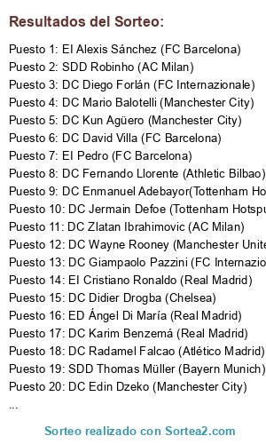 Lista de participantes: SDI Neymar da Silva (Santos), SDD Luis Suárez (Liverpool FC), DC Wayne Rooney (Manchester United), DC Antonio Di Natale (Udinese), DC Radamel Falcao (Atlético Madrid), DC Edin Dzeko (Manchester City), SDD Thomas Müller (Bayern Munich), EI Alexis Sánchez (FC Barcelona), DC Carlos Tevez (Manchester City), DC Hulk (FC Porto), DC Didier Drogba (Chelsea), ED Leo Messi (FC Barcelona), EI Juan Mata (Chelsea), SDD Robinho (AC Milan), EI Ezequiel Lavezzi (SSC Napoli), DC Zlatan Ibrahimovic (AC Milan), DC Diego Milito (FC Internazionale), DC Jermain Defoe (Tottenham Hotspur), SDI Alexandre Pato (AC Milan), DC Giampaolo Pazzini (FC Internazionale), EI Antonio Cassano (AC Milan), EI Gervinho (Arsenal), DC Mario Gómez (Bayern Munich), DC Robin Van Persie (Arsenal), EI Cristiano Ronaldo (Real Madrid), DC Fernando Torres (Chelsea), DC Lisandro López (Olympique Lyon), ED Ángel Di María (Real Madrid), DC Enmanuel Adebayor(Tottenham Hotspur), DC Gonzalo Higuaín (Real Madrid), DC Fernando Llorente (Athletic Bilbao), ED Theo Walcott (Arsenal), DC Edison Cavani (SSC Napoli), DC Kun Agüero (Manchester City), DC Mario Balotelli (Manchester City), DC Diego Forlán (FC Internazionale), DC Samuel Eto'o (FC Anzhi Majachkalá), DC David Villa (FC Barcelona), EI Pedro (FC Barcelona), DC Karim Benzemá (Real Madrid).