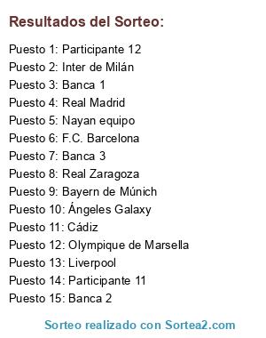 Lista de participantes: Ángeles Galaxy, Olympique de Marsella, Real Zaragoza, Bayern de Múnich, Cádiz, Real Madrid, Nayan equipo, Liverpool, F.C. Barcelona, Inter de Milán, Participante 11, Participante 12, Banca 1, Banca 2, Banca 3.