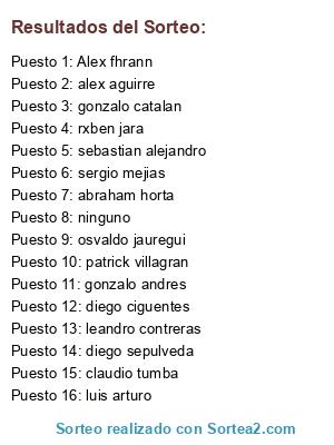 Lista de participantes: Alex fhrann, Sebastian Alejandro, Sergio Alejandro Mejias Mejias, Rxben Jara, Diego Cifuentes, Diego Sepúlveda, Alex Aguirre, Osvaldo Jáuregui Mella, Leandro Contreras Espinoza, Luis Arturo Hernandez Ramos, Claudio Tumba Herrera, Gonzalo Andres Pizarro Galdames, Abraham Isaac Horta Horta, Patrick Villagran, Gonzalo Catalan, n° 16.
