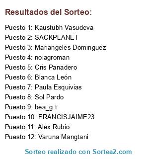 Lista de participantes: sara_mcdls, luismiab, rebeca_cervera_miro, gaiarigamondi, sebnem.b.02, daytona.louise, laurabellan_, huitham_511, vademoda, laianiceday, ilyadem_, akisa1111, victorprietobote, anastasiabondarenkoo, jose_prahe, jackingtrash, carahummus, dianaflrs_, jesuito17, sincerebroninah, marinasanchezj, sammyteeaparty, ana.cb, ciberrober7, noiagroman, bea_g.t, nastyadomracheva, bertalupon15, iris.ipicazo, Txus Sánchester, Aniram HerMar, 최소희, Luis Miguel Alvarez, Monica Edwards, Maria Solano Cano, Mónica Ortiz, Paula Esquivias, Kathy Quick, Ness Kaid Khinache, Dari Chou, Marina Navarro Vilalta, Paula Kozak, Arancha Die, Andrea Garcia, Ingrid Cesareo, Marco Ortiz, Alexandra Florensa Palacios, Wendy Perez, 서동균, Alian Wu, Laia Capo, Marta Martita, Anastasia Macovei, Alberto Conchado Sánchez, Angela Soler, Alejandro Gonzalez, Agustín Morgado León, Brenda Gonzalez Perez, Paula Cuberos, Eduardo Gomez, Marina Parra, Angela Torres Seminario, Alex Rubio, Nikita Warren, Julia Paskalieva, Vicente Luis Gasco Bonias, Leonor Lainho, Ángela García, Laura Salazar Guerrero, Tatiana Soler Fernández, Emma Tikkanen, Gabry Blanco Diaz, Honey Soni, Laura Solé, Marina Sánchez, Lo Napa, Almu Escrig Méndez, Alain Sen, Silvia Fernández Ponce, Ruben Corral Delgado, Mark Geconcillo, Judit Sosa Cordobes, Isabell Morup, Roberto Parro Gonzalez, Chouaib Bendahou, Mariangeles Dominguez, Sol Pardo, Marina Garcia, Lourdes Miralles, Jose Pelaez, Jeroen de Bont, Sara Isabel Rodríguez, Löwe Ap, Nati Lopez Diaz, Alicia Muñoz, Ana Rg, Andrea Lft, Alex Eironeia, Blanca León, Almudena Cg, Rafael Mairén González, Nuria Pineda Barrero, Roger Calpe, Sergio Arnaiz Delgado, Keegan Xerri, Varuna Mangtani, Kaustubh Vasudeva, Maria Amador, Katy De Dann Braun, Laura Naharro, Nakkie Drávama, Juan LS, Rocio Gonzalez Delia, Lidia Pinazo, Toni Aguado Rodenas, Cris Panadero, Nami Rock Zombi, Beatriz Navas Ponce, Cuki Mateo Encina, Abia Santos, Alejandra Garcia, Vicky Gómez-Landero Sánchez, Teresa Santiago Ponce, Bruno Cañenguez, Antonio Utrera, Alba Heredero, Javier Rivera Armada, Roo Garcia Barranquero, Ana Sohaila Homsi, Almudena Román, Laura Oliva Martinez, Andres Cano Duran, Joana Machado, Alberto Mejías, JJ De Luna Garnica, Esther Muñoz Moreno, Natalia Hinojo Garri, Juan Buiza Nuñez, Pablo García Pisa, Joss Tarazona, Nacho Aguilar Caselles, Vicent Salvador Prieto, Almudena Gomez Ascariz, Elena Gutiérrez Ramo, Jesús Ramms Stein, Mike House, Gonzalo Fernández Bernal, Noeki Yamazaki, Alberto Alarcón Sánchez, Jesús Manuel Varela Ponte, María Hernández, Eliisabeth Pozo Morales, Victor PG, Daniela A. Charry, Sandra Perez, Nacho Olóndriz Lazaro, Angie Cuevas, Ana Pérez, Paula Tedín Pérez, Esperanza Caparros, Lorena Cil, Maria Escribano, Simona Spirits, Cristina Gonzalez, Lizandro Sanchez, Blanca Gonzalez Rodriguez, Isabel León Domínguez, Gustavo Cristaldo, Gonzalo Martín Fernández, Ignacio Ahumada Rodríguez, Jaime Trinidad de Haro, Lidia Rivas Juan, Omer K Bakr, Juankar Gibson, Diego Moreno Méndez, D Roberto Lozano Junco, Gonzalo Linares Martínez, Pablo Becerril, Alejandro Sanchez Bretones, Cristian Trabuko Vargas, VANESALUPI, NOELUNA13, CRISTIHARA, MIRENAPF, DECIMAS83, RAULYSANTOS, ROCISANT, OVETUS09, MAMEM07, INCREPONE, JULUVI, YO_CMISMA, YOSOYKINI, JOSEMARIAGUINEA, TIPMLG09, YOUTUBERPARO, RARITOENBIBLIO, BUHOKKI, JUAN_RE_PAN, FESTIREO, BUHOKIM, OPORTUNITYPICKS, AMANTESILENCIO, MIAMANTEBANDIDA, JUANZEVA1, DELUXECAVIAR, LAURITATOPLAURA, JUANMACASTANA, TONYSPECIALONE, TONIENLARED, FRANCISJAIME23, ARNDELSER, CARFERG1, MONICAPRO2, ALBERTODANZARE, CRISPI08, MARITRINI111, SUSMARTOS, KIMIVONIX, RUBENYMC, MARTOSSILVIS, PINKITRAVEL1, ESPESUAREZ, JUANAN231211, JUCADIPO1994, CONSEJOS_FITNES, MONIQUEMAKER, SACKPLANET, WEONE_1, HOYPUEDEQUESI, MONIKAEQUIS2, LAURACARTOON, JUANCA_MELLI, THE_ESTRUCTURA, SOFILLANA.