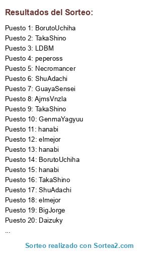 Lista de participantes: TakaShino(4), Daizuky(5), KairiMizukami(6), hanabi(6), GenmaYagyuu(3), BorutoUchiha(4), Duple(3), Necromancer(3), BigJorge(6), AjmsVnzla(1), Magu(3), pepeross(3), THEKILLER666(5), ShuAdachi(5), itasuke(2), LDBM(8), rias(3), marcelokiba(5), elmejor(5), GuayaSensei(4).