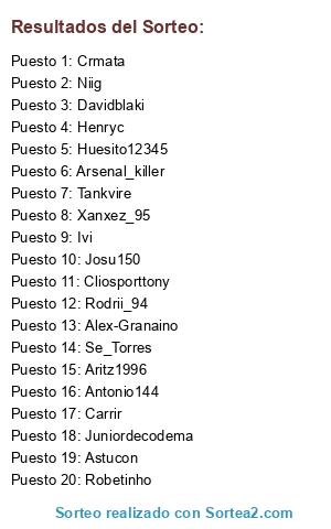 Lista de participantes: Alex-Granaino, Rodrii_94, Huesito12345, Aritz1996, Ivi, Niig, Robetinho, Crmata, Juniordecodema, Josu150, Antonio144, Davidblaki, Tankvire, Se_Torres, Cliosporttony, Xanxez_95, Henryc, Astucon, Carrir, Arsenal_killer.