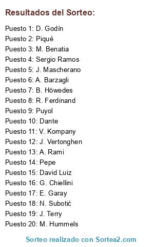 Lista de participantes: Sergio Ramos, Piqué, V. Kompany, M. Hummels, G. Chiellini, Dante, J. Mascherano, A. Barzagli, D. Godín, Pepe, J. Terry, Puyol, R. Ferdinand, N. Subotić, A. Rami, David Luiz, B. Höwedes, M. Benatia, J. Vertonghen, E. Garay.