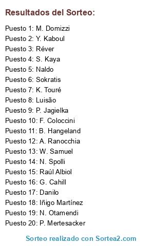 Lista de participantes: F. Coloccini, W. Samuel, Iñigo Martínez, N. Otamendi, Réver, A. Ranocchia, Sokratis, Naldo, N. Spolli, S. Kaya, Danilo, G. Cahill, Y. Kaboul, Raúl Albiol, Luisão, K. Touré, P. Jagielka, P. Mertesacker, M. Domizzi, B. Hangeland.