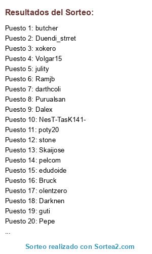 Lista de participantes: xokero, Skaijose, stone, guti, poty20, edudoide, pelcom, olentzero, Bruck, Dalex, Darknen, NesT-TasK141-, ververox, Duendi_strret, shadofdarknes, butcher, Volgar15, julity, Purualsan, darthcoli, chejoperrez, Ramjb, Pepe.