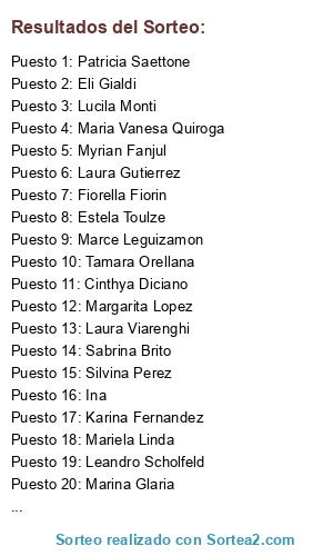 Lista de participantes: Myrian Fanjul, Laura Viarenghi, Margarita Lopez, Karina Fernandez, Naty Carimatto, Eli Gialdi, Lili Di Mauro, Lucila Monti, Luisa, Ina, Marce Leguizamon, Sabrina Brito, Cinthya Diciano, Laura Gutierrez, Leandro Scholfeld, Cristina Casa, Maria Vanesa Quiroga, Marina Glaria, Vanina Serres, Sabrina Basso, Silvina Perez, Patricia Saettone, Nancy Amado, Gaby Schönnagel, Julis Sabatino, Fiorella Fiorin, Estela Toulze, Adriana Samos, Tamara Orellana, Mariela Linda.