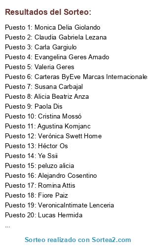 Lista de participantes: Cecilia Solondoeta, Susana Carbajal, Viviana Molina , Nely E Fer , Alejandro Cosentino, Fiore Paiz(2 participaciones), Monica Delia Giolando(9 participaciones), Cristina Mossó, Carteras ByEve Marcas Internacionales, Héctor Os(2 participaciones), Paola Dis(2 participaciones), Agustina Komjanc, Silvia Noemi Colalillo, Lucas Hermida, Romina Attis, María Cecilia Campero, Silvina Laura Cosentino, Diroca Tapiceria, VeronicaIntimate Lenceria, Lali Viterales, Mariela Ibel , Ro Sauer, Fuller Tupperware, Mirta Susana Gonzalez Sanchez, Teresita Riv, Alicia Beatriz Anza , Elena Insfran Franco, peluzo alicia, Verónica Swett Home , Claudia Gabriela Lezana, Ye Ssii, Carla Gargiulo(2 participaciones), Valeria Geres, Vanesa Herrera, Maria Alejandra Berardi, Genara Villalba , Vanesa Blanco , Evangelina Geres Amado, Punkitah Jez Anesteciada, Carina Garcia.