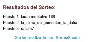 Lista de participantes: inmacmg, laura.montalvo.188, natalie_avoncercedilla, trufula, macavi77, vicent1391, maitechuz, rallam7, la_reina_del_pimenton_la_dalia, noragatos, alicia__cm.