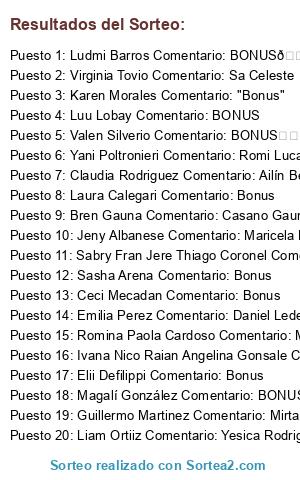- Ganador 1: Ludmi Barros Comentario: BONUS🍀
