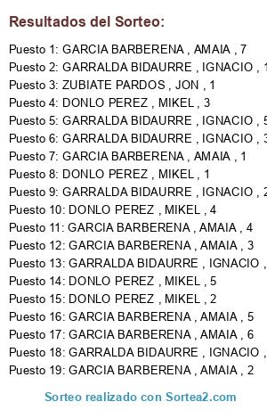 Lista de participantes: GARCIA BARBERENA , AMAIA , 7, GARCIA BARBERENA , AMAIA , 6, GARCIA BARBERENA , AMAIA , 5, GARCIA BARBERENA , AMAIA , 4, GARCIA BARBERENA , AMAIA , 3, GARCIA BARBERENA , AMAIA , 2, GARCIA BARBERENA , AMAIA , 1, ZUBIATE PARDOS , JON , 1, GARRALDA BIDAURRE , IGNACIO , 1, GARRALDA BIDAURRE , IGNACIO , 2, GARRALDA BIDAURRE , IGNACIO , 3, GARRALDA BIDAURRE , IGNACIO , 4, GARRALDA BIDAURRE , IGNACIO , 5, GARRALDA BIDAURRE , IGNACIO , 6, DONLO PEREZ , MIKEL , 5, DONLO PEREZ , MIKEL , 4, DONLO PEREZ , MIKEL , 3, DONLO PEREZ , MIKEL , 2, DONLO PEREZ , MIKEL , 1.