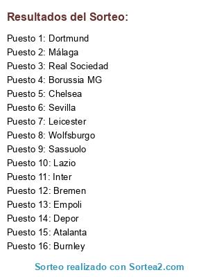Lista de participantes: Málaga, Wolfsburgo, Atalanta, Sevilla, Sassuolo, Empoli, Depor, Inter, Borussia MG, Chelsea, Leicester, Burnley, Bremen, Lazio, Dortmund, Real Sociedad.