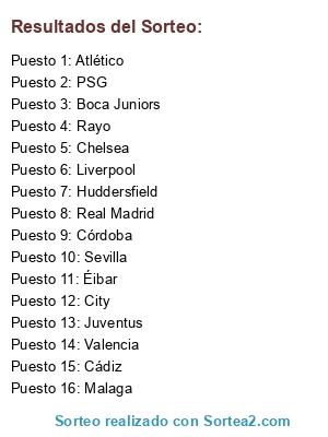 Lista de participantes: Cádiz, Real Madrid, Sevilla, Éibar, Chelsea, PSG, Córdoba, Boca Juniors, Rayo, Juventus, City, Liverpool, Malaga, Valencia, Atlético, Huddersfield.