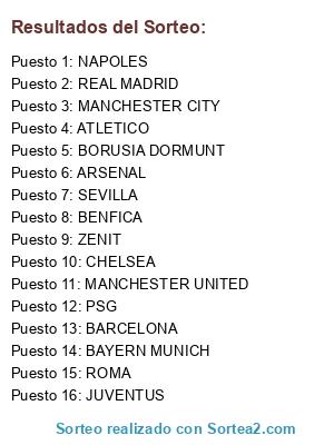 Lista de participantes: ATLETICO, BARCELONA, REAL MADRID, SEVILLA, JUVENTUS, NAPOLES, ROMA, BENFICA, ZENIT, BORUSIA DORMUNT, BAYERN MUNICH, PSG, ARSENAL, CHELSEA, MANCHESTER CITY, MANCHESTER UNITED.