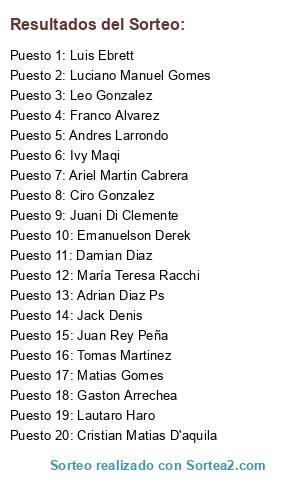 Lista de participantes: Luis Ebrett, Ariel Martin Cabrera, Juan Rey Peña, Andres Larrondo, Lautaro Haro, Franco Alvarez, Leo Gonzalez, Tomas Martinez, María Teresa Racchi, Juani Di Clemente, Gaston Arrechea, Ciro Gonzalez, Emanuelson Derek, Adrian Diaz Ps, Cristian Matias D'aquila, Ivy Maqi, Luciano Manuel Gomes, Damian Diaz, Jack Denis, Matias Gomes.