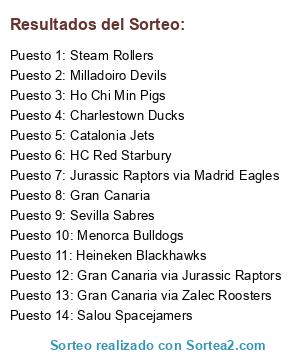 Lista de participantes: Charlestown Ducks (250), Milladoiro Devils (200), Gran Canaria (150), HC Red Starbury (125), Ho Chi Min Pigs (100), Jurassic Raptors via Madrid Eagles (90), Steam Rollers (80), Gran Canaria via Jurassic Raptors (70), Heineken Blackhawks (60), Sevilla Sabres (50), Menorca Bulldogs (40), Gran Canaria via Zalec Roosters (30), Catalonia Jets (20), Salou Spacejamers (10).