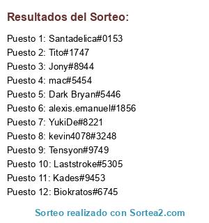 Lista de participantes: Joaquin#8346, !IzumiNoBowser#1311, Nixuizu#1949, Aryne#6655, BaallxD#0164, Pablo#9408, alexander_ktk#9958, Esme#7037, Moonlight#5806, Neoxz#0857, Breew18#0856, Fredy-R#1785, Dano#6174, Cookie#8776, Violatronix#3915, Hiro Kun#0182, Biokratos#6745, Ragged#3637, Anteros#7598, yashun#2244, lucho#4448, Lumy™#1752, FredoS2#7632, RMA😇😈#8371, erevent#6692, Sole#6417, criatura#1062, CbCd#7431, Ovejero#6445, FromHeroToZero#0463, [UwU]#7428, AdrianYarny#9149, Glargian#3814, M̶̛̎i̴͒̽s̶͗͐ĥ̸̀ȕ̷#9975, shusita#8834, sebasuru#8132, Eme#0880, Maximiliano.M#8030, Aioros#4859, Hoshi_1412#7645, Laststroke#5305, Alan-blink#6190, P A T#6316, deathdrak#7541, decimods#5712, Krl0z#6164, Namzak#6379, omaralonso#4772, Travi§#8357, Neil.#7941, YukiDe#8221, aldairux#9218, Beny#2888, souta#9376, Alex Kyrielite#9442, Gabito9992#3263, Thlipsi#4401, Iván#0856, Arucark#7322, darktez#9171, Dummy Slayer#9147, Androw#3227, Nando#8075, Emmanuel#2947, Dark Bryan#5446, Cintyvc#2824, fercatherGG B]#4310, Kuriki#3825, Miku Chan#6455, Edo#5532, mac#5454, Kades#9453, Nemi#0812, dk ito#9037, Gewe#9567, Jaeger#1017, ☆;+;。・𝓟𝓸𝓵𝓪𝓻𝓲𝓼・。;+;☆#1021, TonySenpai#6100, DeibyTex#9200, severus#2038, ✌ Chris ✌#1796, migueljsd#9335, Vicke ~#8705, pepe berrinches#1727, Bibianz#1989, jhayjozerav#4051, aldo#8840, kiranick86#2261, Bohe#4063, Samleth#9910, Dokkä#2819, Deltarys#5909, kevin4078#3248, truterth#1156, Aniitaa^™#4826, alexis.emanuel#1856, El Tino#5342, damd#5460, Mahkakko!#5380, CapitAn#9656, XAVIER.88#3994, zendory0199#2894, trollk#0066, kioto25mr#5727, Libe~*#7453, Tensyon#9749, Rina Li#0853, Lizz#1156, rafa#5167, Black Sword#8144, Nova👑#6239, Nefer#7664, flori#1878, kornerita#9545, ikaros006#9194, ELPETULANTE#4176, aass#7303, Affar#6654, Gonzo#5529, Corentin#3033, p3p3#5099, Hermes#8310, Jony#8944, therion#8522, Shaman Free Style#6807, Devil Brando~#4526, Nicufis#2828, Tito#1747, Mei#8128, emilio#5405, Mostaza -#8887, Sinoe#3140, Santadelica#0153, Triari#1463, Rakelin#0097, Will.#8034, Tio Lucho#7493, Suiziter [Mancos INC]#7324, Niyasaky [Mancos INC], Ironside#7243, Kayneo [Mancos INC]#3934, Dev Obiwan#2352, LemLem#9181, isak#5504, 𝑩𝒍𝒂𝒄𝒌 𝑬𝒎𝒑𝒆𝒓𝒐𝒓𝒔 卍#4920, TacoFiuFiu#4071, Lavizth#3873, BlackNeoUwU#7165, carliwis_xd#6790, ALBEDOO#3337, KinGTetton#1998, 绵绵#9269, 🌸 Yuuri 🌸#5105, Jim Macken#3212, KasathMs#8809, KuroValx#2407, !Meron#3764, LicaonYugo#5958.