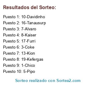 Lista de participantes: 1-Chico, 2-Xipi, 3-Coke, 4-Litus, 5-Pipo, 6-Sergio, 7-Alvaro, 8-Kaiser, 9-Karman, 10-Davidinho, 11-Sendeta, 12-Ramos, 13-Kion, 14-Oskis, 15-nAi10, 16-Tanausurp, 17-Furri, 18-PireLLi, 19-Kefergas, 20-Ruu.