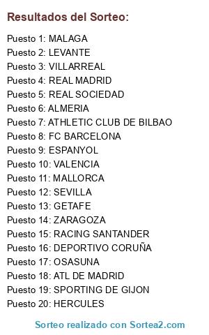 Lista de participantes: GETAFE, SEVILLA, ALMERIA, VALENCIA, ATL DE MADRID, MALAGA, HERCULES, RACING SANTANDER, DEPORTIVO CORUÑA, ATHLETIC CLUB DE BILBAO, ZARAGOZA, MALLORCA, ESPANYOL, LEVANTE, VILLARREAL, REAL SOCIEDAD, REAL MADRID, OSASUNA, FC BARCELONA, SPORTING DE GIJON.