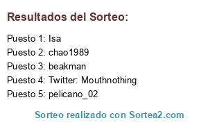 Lista de participantes: beakman, nash, nash-2, Josh_Master, Link_DS, Albertini, chao1989, JuanjoLM, JuanjoLM-2, Mimiko, Isa, pelicano_02, Kratos3D, Anita, vicovico, probe, Twitter: elotronash, Twitter: chao1989, Twitter: Mouthnothing, Twitter: pelicano_02, Twitter: EstherAsuka, Twitter: Isa25A, Twitter: Kuroige.