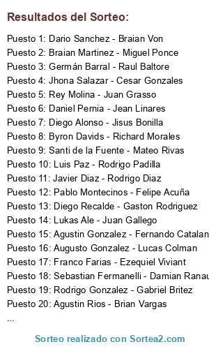 Lista de participantes: Braian Martinez - Miguel Ponce, Dario Sanchez - Braian Von, Augusto Gonzalez - Lucas Colman, Agustin Gonzalez - Fernando Catalan, Rey Molina - Juan Grasso, Joel Ruiz - Darley Perez, Pablo Montecinos - Felipe Acuña, Jhona Salazar - Cesar Gonzales, Germán Barral - Raul Baltore, Lukas Ale - Juan Gallego, Agustin Rios - Brian Vargas, Javier Diaz - Rodrigo Diaz, Diego Alonso - Jisus Bonilla, Diego Recalde - Gaston Rodriguez, Byron Davids - Richard Morales, Luis Paz - Rodrigo Padilla, Franco Farias - Ezequiel Viviant, Sebastian Fermanelli - Damian Ranaudo, Daniel Pernia - Jean Linares, Santi de la Fuente - Mateo Rivas, Rodrigo Gonzalez - Gabriel Britez, Sebastián Sepúlveda - Robert Sepúlveda.