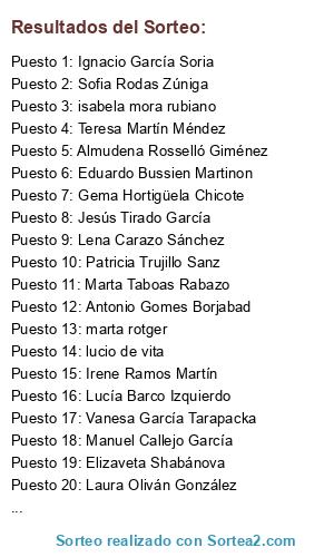 Lista de participantes: Silvia Izquierdo Sanz , lucio de vita , Almudena Rosselló Giménez , isabela mora rubiano , Teresa Abril Tamayo , Antonio Gomes Borjabad , Julia Silveira Martín , Irene Ramos Martín , Elizaveta Shabánova , Vanesa García Tarapacka , Lena Carazo Sánchez , Laura Oliván González , Patricia Trujillo Sanz , Teresa Martín Méndez , Daniel Del blanco Alonso , María Isabel Casas Rivera , Ignacio García Soria , Lucía Barco Izquierdo , Laura Carmona Machin , Jesús Tirado García , Sofía García Varela , Sofia Rodas Zúniga , Eduardo Bussien Martinon , Manuel Callejo García , Aida Ramos Quevedo , Marta Taboas Rabazo , Gema Hortigüela Chicote , marta rotger , Pilar Talavera Cordero.