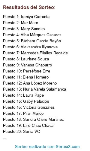 Lista de participantes: Claudia Peña, Sandra Ruiz, Aleksandra Iliyanova, Sandra LR, Patricia Pastor, Marisa Acebron, Olmedilla Cien, Marisa Muñoz, Patricia Serrano, Maria Pilar Rodrigo Hernando, Denise Cruz, Rachel Mills, Luisa Muñoz, Mary Saneiro, Sandra Perales, Lydia Castilla, Perséfone Erre, Maríaa Garcíaa Badillo, Margarita Alcantara Estupiñan, Gabriela Cristina, Ireniya Curranta, Tania M. Giménez, Angela Perez, Sandra Otero Martinez, Blanca Cruz, Bárbara Lage Millet, Silvia Serrano, Preom Leo, Natalia Rodriguez Izquierdo, Sandra FFr, Sandra Rguez Prol, Laurys Jara, La Mejorcisima Vk, Laura López Lería, Julia Paskalieva, Vanesa Chaparro, Noelia Pluma Blanca, Carrascosa Cien, Beita Limon, Mar Mero, Carol Ruiz, Esther Lobo Núñez, Sarah F. Villalba, Nuria Varela Salamanca, Fatima Salamanca, Wendy Jaramillo, Eva Serrano, Alba Márquez Casares, Beatriz Rodriguez, Yolanda Paton, Luisa Sousa, Isabel Rdll, Ana López Moreno, Elena Hornero, Mónica Sgca, Ana Pulido, Chely Ksco, Bárbara García Bayón, Jessy James, Gaby Palacios, Nada De Nada, Tamara Sanchez, Maria Victoria Martinez, Karly Qzd, Monica Carmona Nielfa, Maria Barrios, Vane Cespedes, Nuria Barragán, Laura Pape, Raquel Álamo, Veronica RC, Aria Loa, Mercedes Fiiallos Recalde, O Mery Maria, Ana M Muñoz Mainar, Francis Natali, Ana Garces Carrasco, Sonia VC, Pilar Marco, Jessk C-a, Inma Navarro Ruiz, Victoria González, Leticia Prieto, Ann Monet, Yas Toy Bien, Lauriene Souza, Vanessa Ramos Perez, Rosa Rio, Maria Marie, Eire-Chax Chacal, Rosalinda Mendez Cruz, .