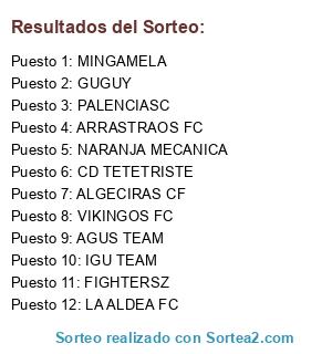 Lista de participantes: VIKINGOS FC, PALENCIASC, FIGHTERSZ, ARRASTRAOS FC, CD TETETRISTE, NARANJA MECANICA, ALGECIRAS CF, AGUS TEAM, LA ALDEA FC, MINGAMELA, IGU TEAM, GUGUY.