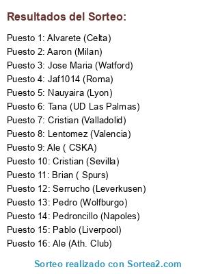 Lista de participantes: Cristian (Sevilla), Nauyaira (Lyon), Pedroncillo (Napoles), Serrucho (Leverkusen), Pablo (Liverpool), Jose Maria (Watford), Jaf1014 (Roma), Pedro (Wolfburgo), Tana (UD Las Palmas), Ale (Ath. Club), Alvarete (Celta), Aaron (Milan), Cristian (Valladolid), Lentomez (Valencia), Ale ( CSKA), Brian ( Spurs).