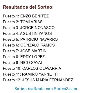 Lista de participantes: TOMI ARIAS, GONZALO RAMOS, JESUS MARIA FERNANDEZ, RAMIRO YANNETTI, CARLOS OLAVARRIA, PATRICIO NAVARRO, EDDY LOPEZ, ENZO BENITEZ, JORGE NONASCO, NICO SAYAL, AGUSTIN YANOS, JOSE MARTIN.