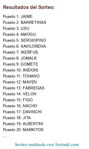 Lista de participantes: XAVILORENA, ALBERTINI, JARA, DIEGO, FABREGAS, FIGO, BARRETINAS, ANDONI, MARKITOS, GOMETE, MIIGUUEEZ, FRANBE, JITA, TONANO, IKERFUS, JAIME, PELIZELLI, ARASE, NENE, SPARROW, JOMALK, SERGIOPINO, PIPI, VELON, ROGER, AMOGU, MARISCAL, XAVIALGAR, DAVINCHI, USU, ANTONIOORDEN, BERTO, MOISES, NACHO, MAOM, MAYEN, PAYBOL, ALEXRATT, PATA, ORLANDO.