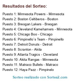 Lista de participantes: Haya Pazz - Pimpinelo (10), Matraco Bullets - Matraco (30), Detroit Donuts - Detroit (40), Atlanta Tragics - Cleveland (50), Scranton - Akita (60), Akita Rangas - Minnesota (70), Pimpinello´s Team - Pimpinello (80), Boston Celtiberos - Boston (90), Chicago Boo - Chicago (100), Cleveland Kamehamers - Minnesota (150), Breogan Lakers - Breogan (200), Minnesota Powers - Minnesota (250).