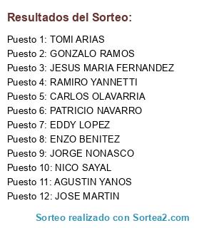 Lista de participantes: JORGE NONASCO, PATRICIO NAVARRO, JESUS MARIA FERNANDEZ, NICO SAYAL, AGUSTIN YANOS, TOMI ARIAS, ENZO BENITEZ, RAMIRO YANNETTI, EDDY LOPEZ, JOSE MARTIN, GONZALO RAMOS, CARLOS OLAVARRIA.