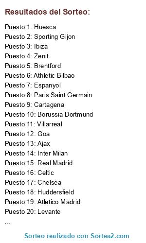 Lista de participantes: PAULI, HUDDERSFIELD, CHELSEA, CELTIC, VALENCIA, GOA, ZARAGOZA, ARGENTINO, BRENTFORD, INTER, GIJON, MANCHESTER UNITED, ZENIT, BETIS, BARÇA, PSG, CARTAGENA, LEVANTE, DORTMUND, BAYERN, REDBULL, VILLARREAL, OSASUNA, LIVERPOOL, AJAX, ESPANYOL, ATLETICO, BOCA, ATHLETIC, IBIZA, HUESCA, MADRID.