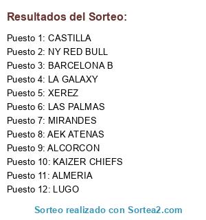 Lista de participantes: XEREZ, CASTILLA, AEK ATENAS, LUGO, ALMERIA, KAIZER CHIEFS, LA GALAXY, ALCORCON, NY RED BULL, MIRANDES, BARCELONA B, LAS PALMAS.