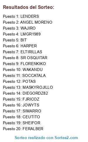 Lista de participantes: FLORENKIKO, LENDERS, SHEIFOR, FERALBER, JOWYTS, WAKANDU, DIEGORDZ82, FJRICOZ, SOCCATALA, BIT, SR OSQUITAR, MASKYROJILLO, ANGEL MORENO, POTAS, CEUTITO, LMGR1989, ELTIRILLAS, SIMARRO, HARPER, WAJIRO.