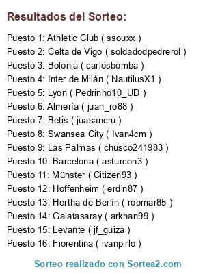 Lista de participantes: Athletic Club ( ssouxx ), Barcelona ( asturcon3 ), Bolonia ( carlosbomba ), Levante ( jf_guiza ), Almería ( juan_ro88 ), Hertha de Berlín ( robmar85 ), Celta de Vigo ( soldadodpedrerol ), Swansea City ( Ivan4cm ), Münster ( Citizen93 ), Inter de Milán ( NautilusX1 ), Lyon ( Pedrinho10_UD ), Fiorentina ( ivanpirlo ), Hoffenheim ( erdin87 ), Las Palmas ( chusco241983 ), Galatasaray ( arkhan99 ), Betis ( juasancru ).