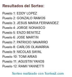 Lista de participantes: CARLOS OLAVARRIA, ENZO BENITEZ, PATRICIO NAVARRO, JORGE NONASCO, GONZALO RAMOS, NICOLAS SAYAL, EDDY LOPEZ, JOSE MARTIN, TOMI ARIAS, JESUS MARIA FERNANDEZ, RAMII YANNETTI, AGUSTIN YANOS.
