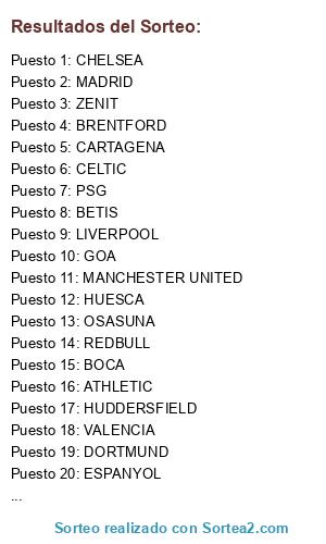 Lista de participantes: VILLARREAL, OSASUNA, LIVERPOOL, AJAX, ESPANYOL, ATLETICO, BOCA, ATHLETIC, IBIZA, HUESCA, MADRID, MANCHESTER UNITED, ZENIT, BETIS, BARÇA, PSG, CARTAGENA, LEVANTE, DORTMUND, BAYERN, REDBULL, PAULI, HUDDERSFIELD, CHELSEA, CELTIC, VALENCIA, GOA, ZARAGOZA, ARGENTINO, BRENTFORD, INTER, GIJON.