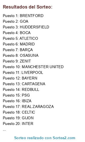 Lista de participantes: MANCHESTER UNITED, ZENIT, BETIS, BARÇA, PSG, CARTAGENA, LEVANTE, DORTMUND, BAYERN, REDBULL, VILLARREAL, OSASUNA, LIVERPOOL, AJAX, ESPANYOL, ATLETICO, BOCA, ATHLETIC, IBIZA, HUESCA, MADRID, ST PAULI, HUDDERSFIELD, CHELSEA, CELTIC, VALENCIA, GOA, REAL ZARAGOZA, ARGENTINOS, BRENTFORD, INTER, GIJON.