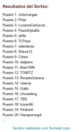 Lista de participantes: Alan1099, bryan66, Chres, chuwaking, Danii, delpiero, Elvagayo, Gallo, Hansporong4, LucianoCarluccio, nberna, nderakore, okfle, PauloDybalfa, Pedronii, Pinia, RicardoGareca, Sheva12, TBS, TLPepo, TOBITZ, victorvargas.