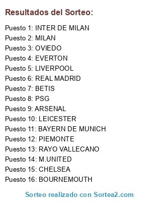 Lista de participantes: BAYERN DE MUNICH, OVIEDO, PIEMONTE, INTER DE MILAN, RAYO VALLECANO, PSG, MILAN, REAL MADRID, M.UNITED, LIVERPOOL, LEICESTER, EVERTON, ARSENAL, CHELSEA, BOURNEMOUTH, BETIS.