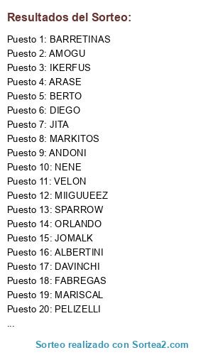 Lista de participantes: MAYEN, PAYBOL, ALEXRATT, PATA, ORLANDO, JAIME, PELIZELLI, ARASE, NENE, SPARROW, AMOGU, MARISCAL, XAVIALGAR, DAVINCHI, USU, FIGO, BARRETINAS, ANDONI, MARKITOS, GOMETE, JOMALK, SERGIOPINO, PIPI, VELON, ROGER, MIIGUUEEZ, FRANBE, JITA, TONANO, IKERFUS, XAVILORENA, ALBERTINI, JARA, DIEGO, FABREGAS, ANTONIOORDEN, BERTO, MOISES, NACHO, MAOM.