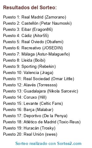 Lista de participantes: Alavés (Torressss), Real Sociedad (Omar Little), Huracán (Trosky), Real Oviedo (Obafemi), Cádiz (Aitor55), Valencia (Jraga), Recreativo (JOSEDIN), Barça (Malabar), Deportivo (De la Penya), Málaga (Astur-Malagueño), Real Madrid (Zamorano), Castellón (Petar Naumoski), Eibar (Eragon86), Real Unión (swes), Levante (Celtic Fans), Lleida (Boibi), Atlético de Madrid (Toxic-Reus), Coruxo (Hill), Sporting (Rebekin), Guadalajara (Nikola Sarcevic).